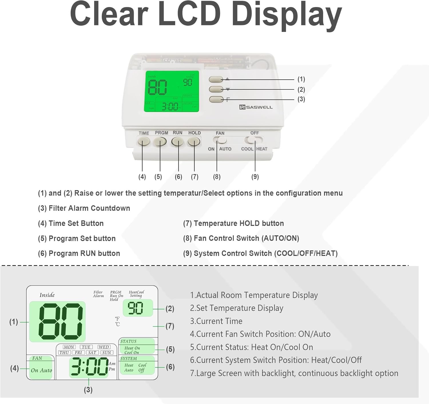 Programmable Thermostat 1H/1C, Household Thermostatfor Heat Pump and Conventional Single Stage System, Digital, Easy DIY Installation